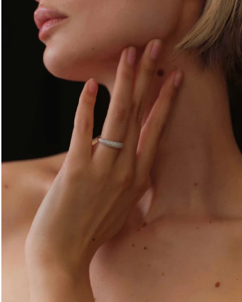 A clean, sculptural pinky ring dusted in dense micro-pavé, catching light in a soft, liquid shimmer.