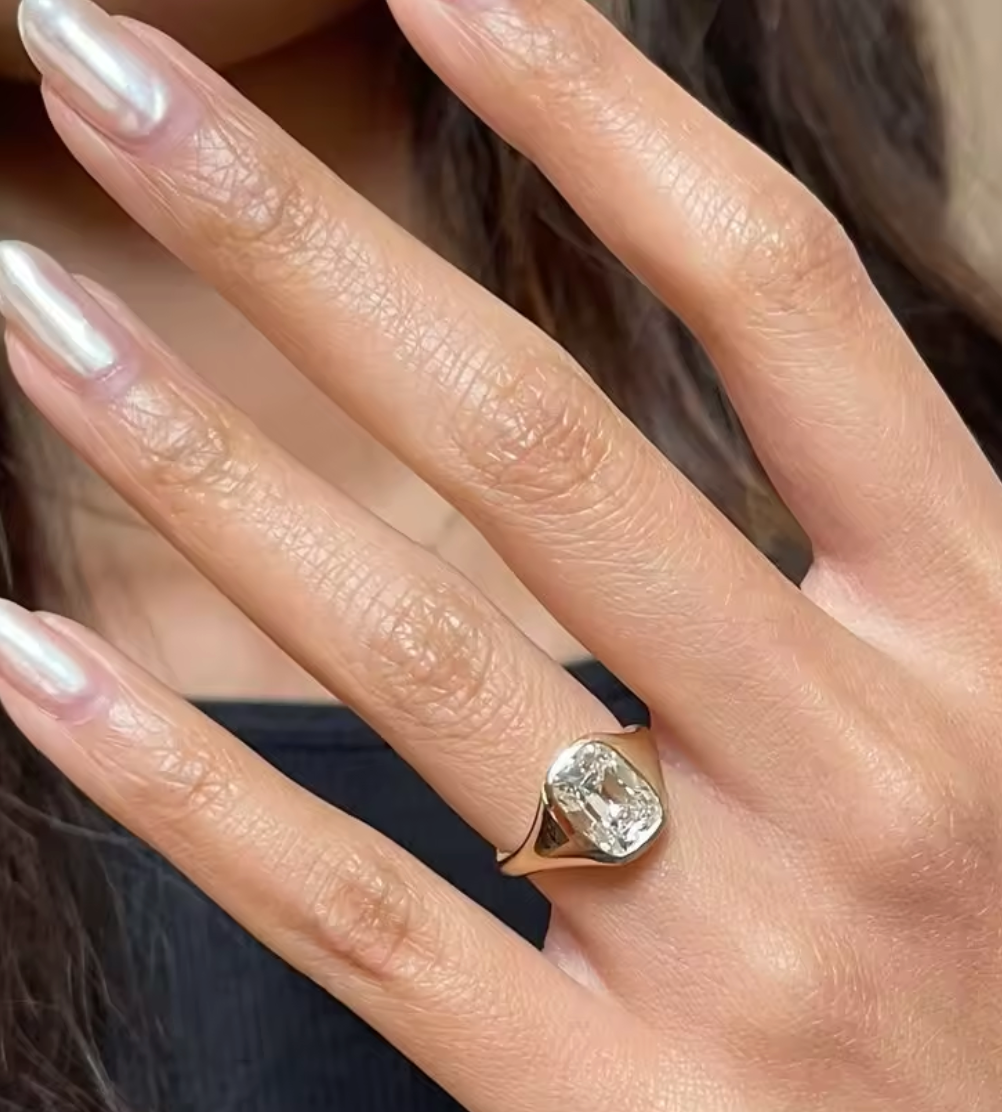 This 14K-gold band is set with a square-cushion brilliant-cut stone, blending antique charm with a clean, contemporary silhouette.