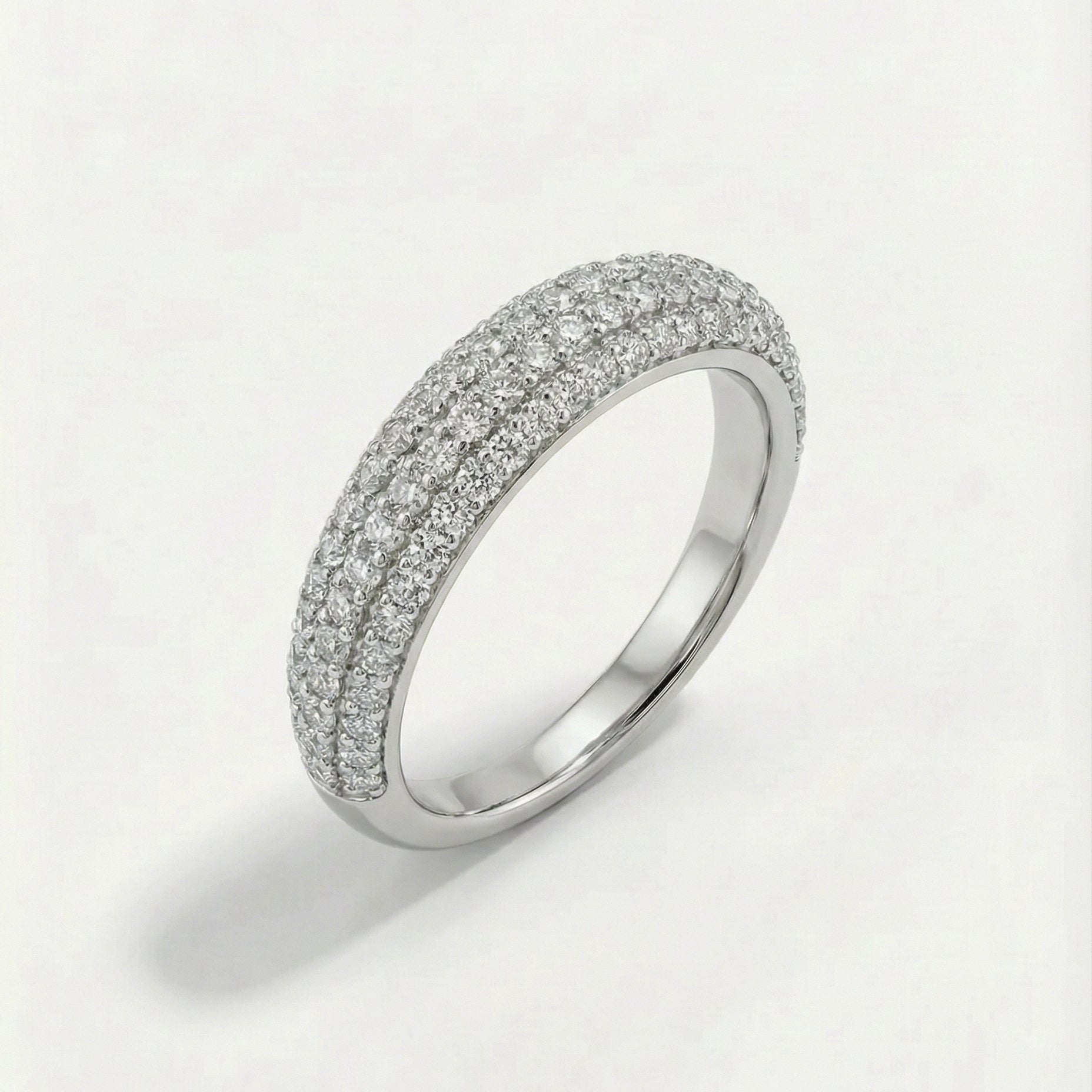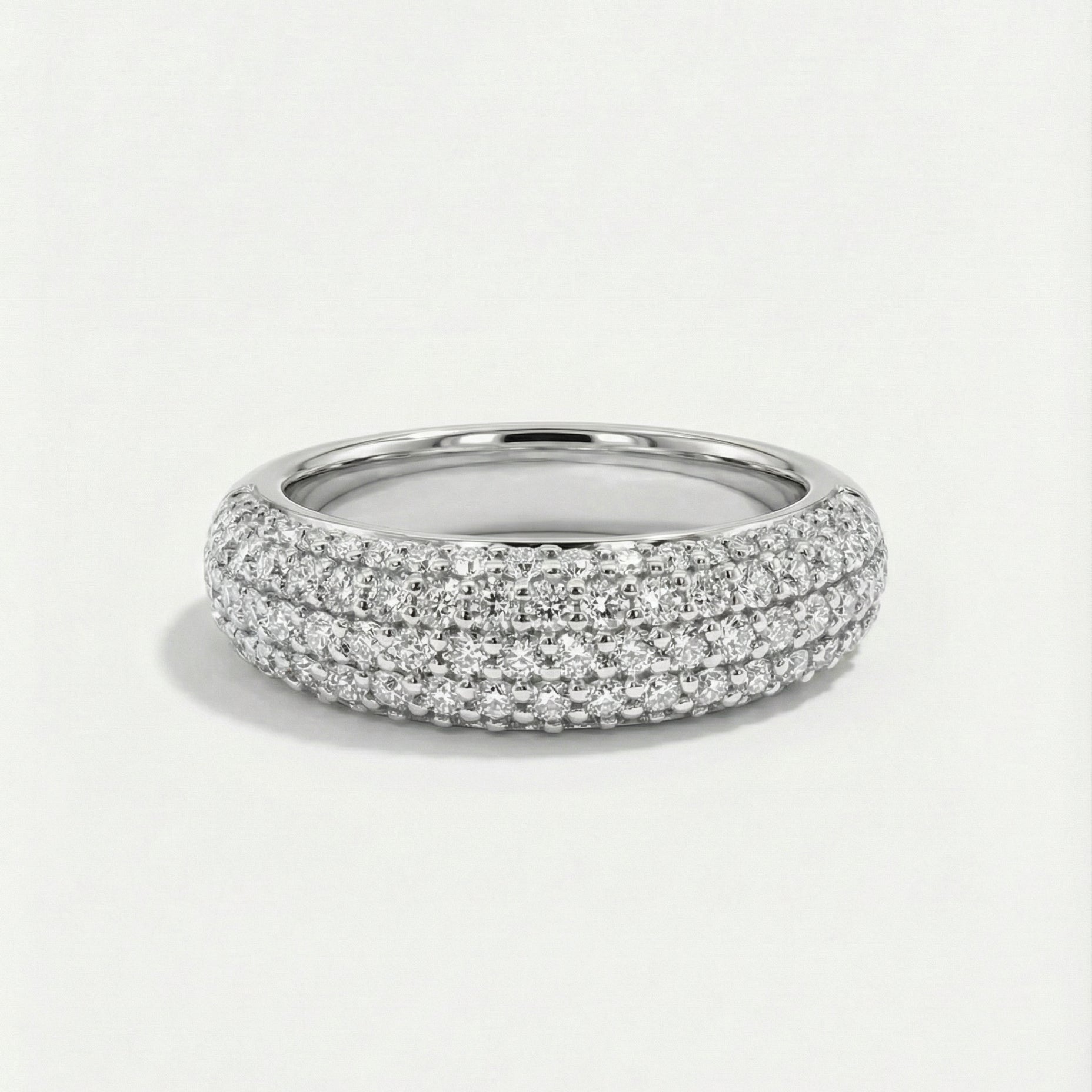 This Petite Luxe pavé band is sculpted in gold and set with fine pavé diamonds in mixed micro sizes, creating a soft, continuous shimmer that moves with the hand. Individually placed stones form a low-profile, rounded silhouette designed for everyday wear.
